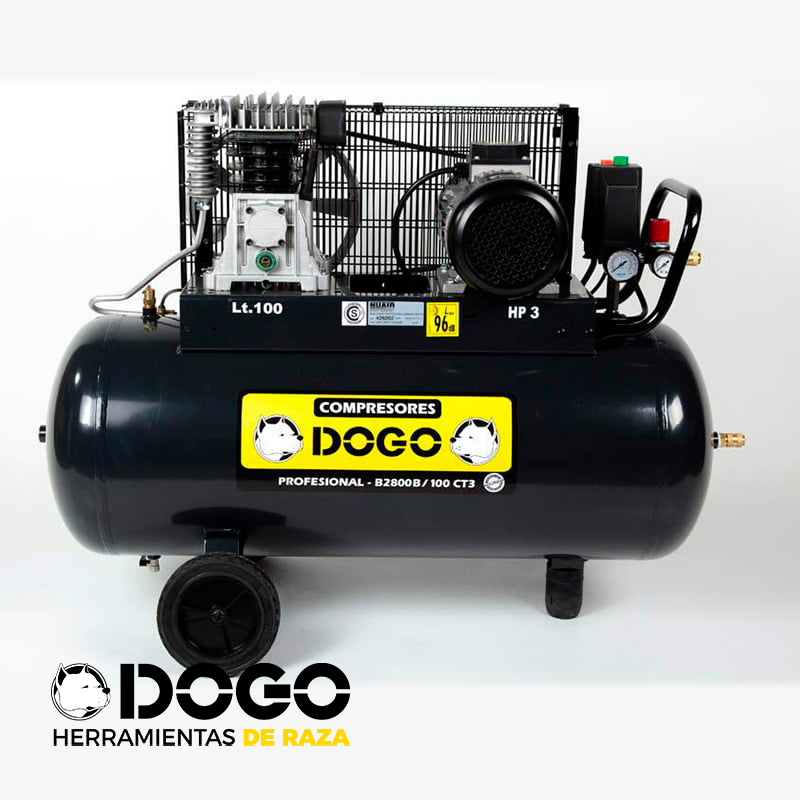 Compresor de 100lts uso profesional ideal para trabajos en industrias equipado con una manija y ruedas plasticas con recubrimiento en goma y mayor diametro que facilita el traslado sobre toda superficie absorbiendo las vibraciones. Tiene incorporado un manometro que permite controlar la cantidad de aire que tenemos depositado en el tanque. Tambien trabaja con un presostato que al llegar a una presion determinada corta automaticamente la marcha del motor y un filtro de aire que protege al equipo en caso que ingrese alguna particula que pueda obstruir la aspiracion. Como medida de proteccion incluye una valvula de seguridad la cual salta en caso de que haya un exceso de presion en el tanque. Evitando accidentes. Trabaja con un motor trifasico de 3 hp bobinado en cobre y montado sobre rodamientos blindados que permite tener una mayor prestacion del equipo. Transmision a correa. Con un cabezal bicilindrico en linea que permite tener una carga completa del tanque en menor tiempo. Asi mismo ayuda al tiempo de recuperacion sea mucho mas eficiente. Viene con una salida de aire a traves de un regulador con acople rapido. La cual es muy practica a la hora de utilizar accesorios como por ejemplo pistolas de pintar ya que podemos regular con mayor precision la presion de aire deseada. Tambien tiene incorporada otra salida directa sin regulador desde el tanque con acople rapido